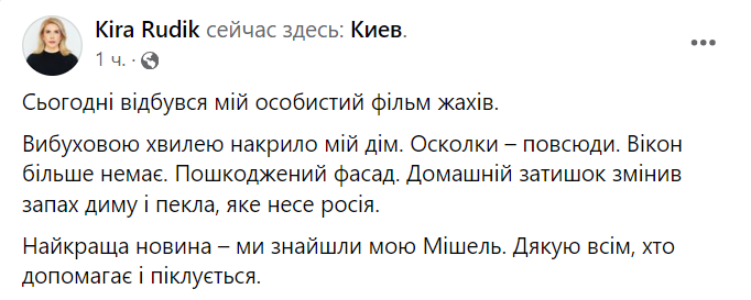 Сегодня во время ракетной атаки РФ в Киеве от взрывной волны пострадал дом народного депутата Киры Рудык.