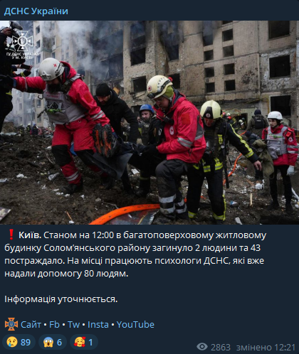 "Киев. По состоянию на 12:00 в многоэтажном жилом доме Соломенского района погибли 2 человека и 43 пострадали. На месте работают психологи ГСЧС, которые уже оказали помощь 80 людям". - говорится в сообщении ГСЧС