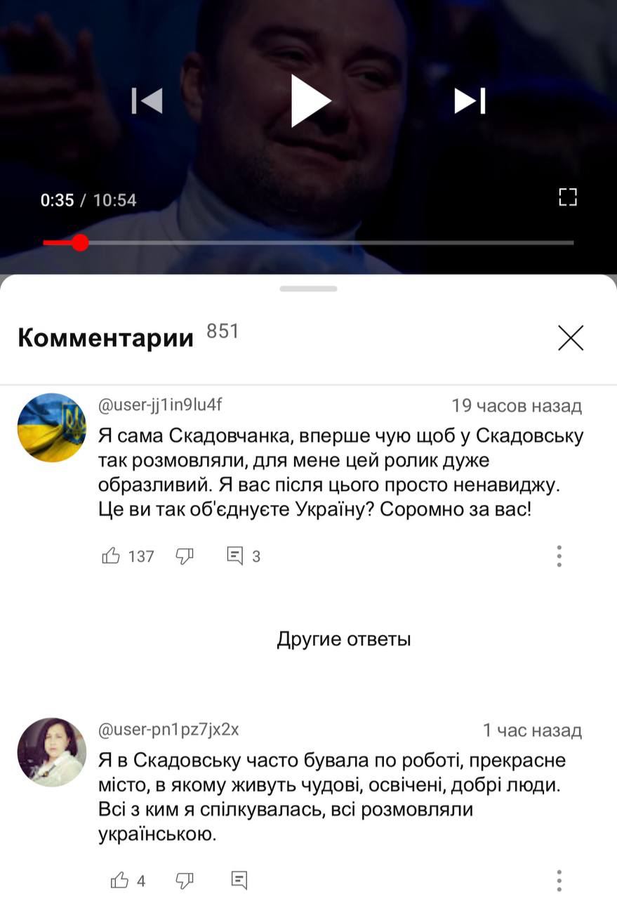 "Плюнули в душу"; "Я сама скадовчанка, впервые слышу, чтобы в Скадовске так разговаривали, для меня этот ролик очень оскорбительный. Я вас после этого просто ненавижу. Это вы так объединяете Украину? Стыдно за вас"; "Испанский стыд! Как так можно, в Скадовске очень красиво говорят на украинском, так и на русском тоже. Хочу знать авторов этого дерьма! Каждую фамилию хочу узнать!"; "Дно. Это ж какой гнилой личностью нужно быть, чтобы так неуважительно шутить о людях из оккупации", - пишут пользователи.