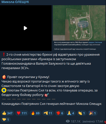 "Жду от вражеской пропаганды такого же эпического отчета из Севастополя и Евпатории 4 января, и еще раз спасибо пилотам Воздушных сил и всем, кто планировал операцию, за безупречную боевую работу!" - написал Николай Олещук.