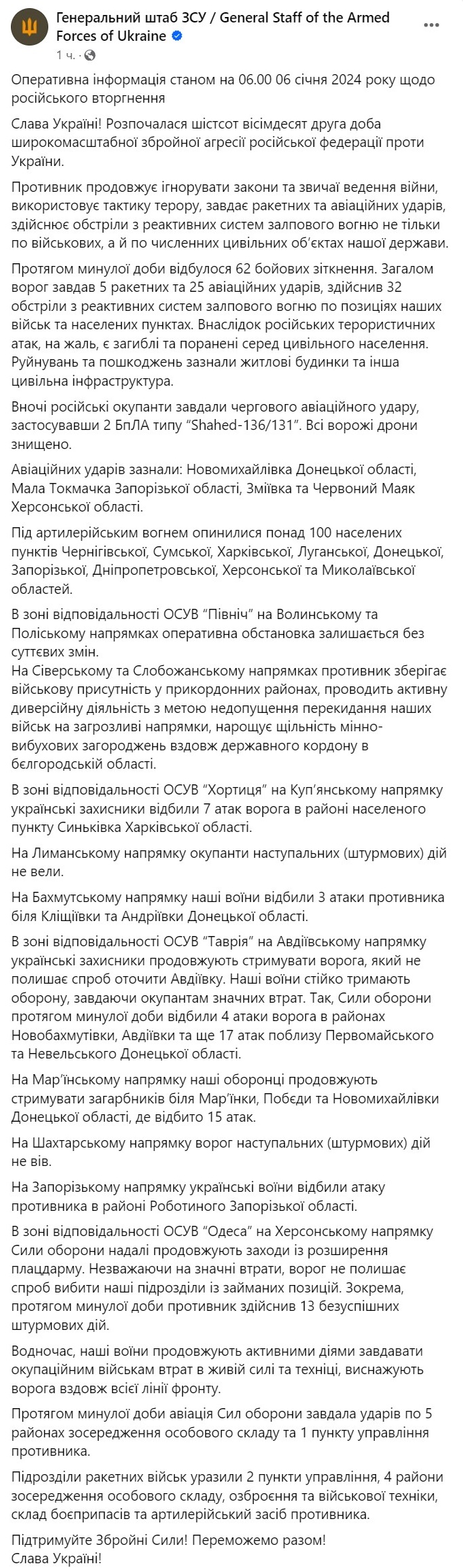 За прошедшие сутки произошло 62 боевых столкновения. Всего враг нанес 5 ракетных и 25 авиационных ударов, совершил 32 обстрела из РСЗО по позициям наших войск и населенным пунктам.