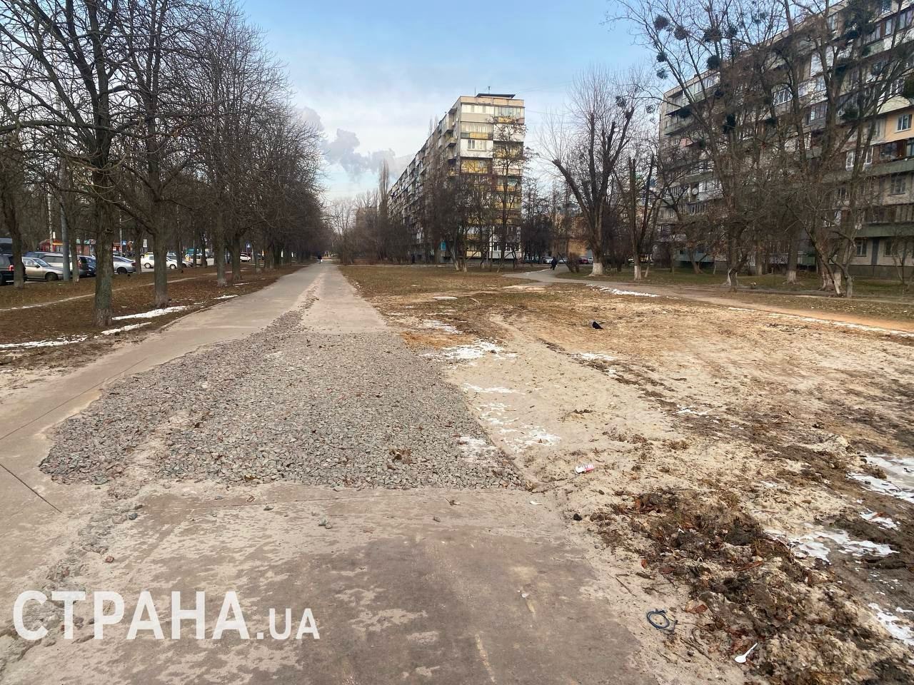 На Борщаговке в Киеве, где в ночь на 8 января произошел прорыв на улице Жюля Верна, коммунальщики с утра чистят лед, который намерз на дороге.