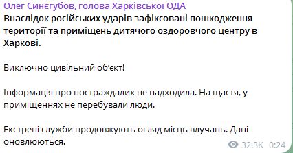 Позже мэр Харькова Игорь Терехов уточнил, что речь о детском лагере на окраине города.