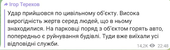 По информации мэра, один ракетный удар пришелся по гражданскому объекту. Как сказано в его посте, велика вероятность жертв среди находившихся в нем людей.