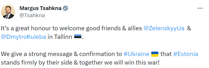 "Большая честь приветствовать добрых друзей и союзников Владимира Зеленского и Дмитрия Кулебу в Таллинне. Мы даем мощный сигнал и заверение Украине, что Эстония твердо стоит на стороне украинцев, и вместе мы победим в этой войне", - говорится в сообщении.