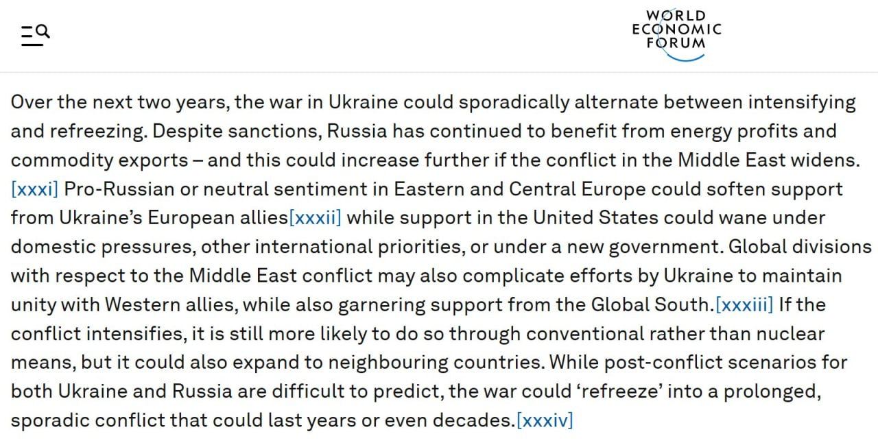 12.45 Война в Украине в ближайшие два года "может периодически сменяться то обострением, то замораживанием", говорится в докладе форума в Давосе по оценке глобальных рисков на 2024 год