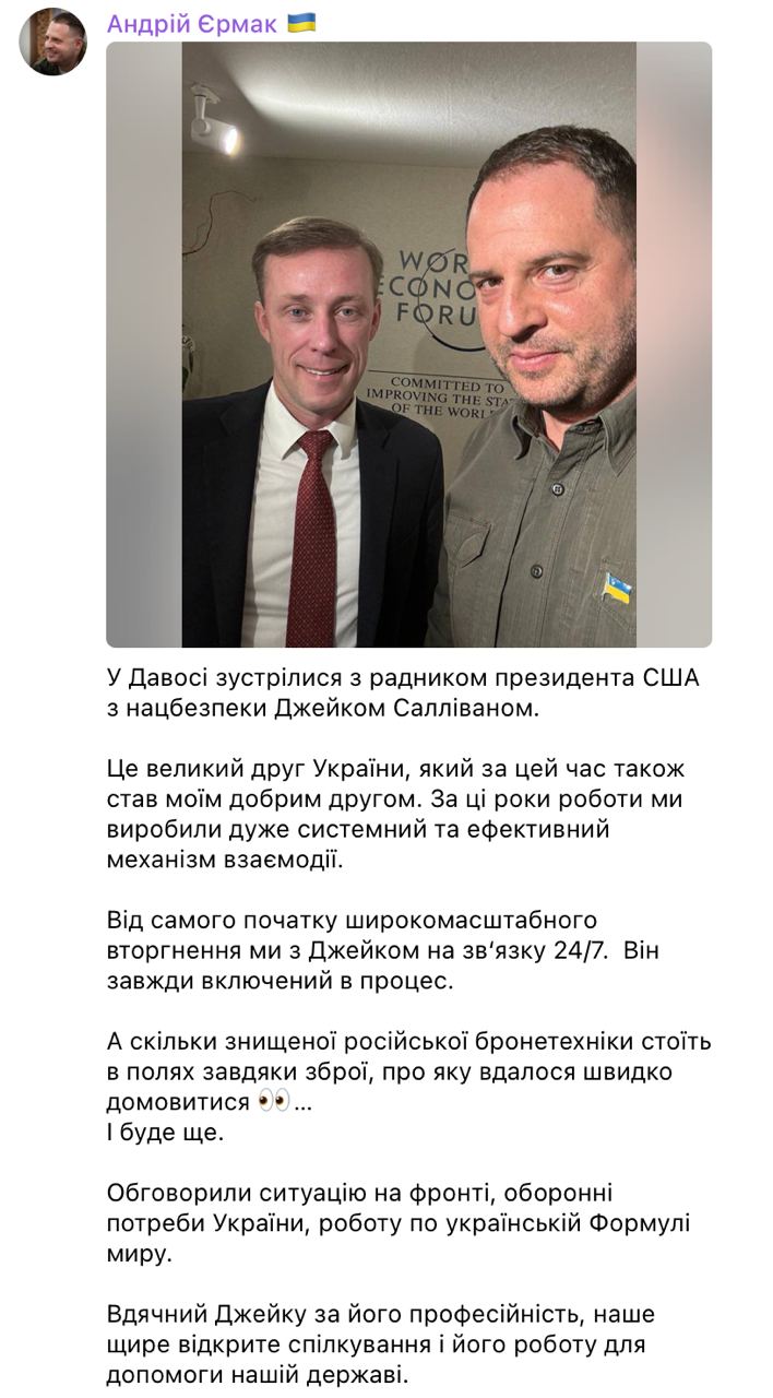 13.40 Глава ОП Ермак опубликовал фото со встречи с советником президента США по нацбезопасности Джейком Салливаном в Давосе.