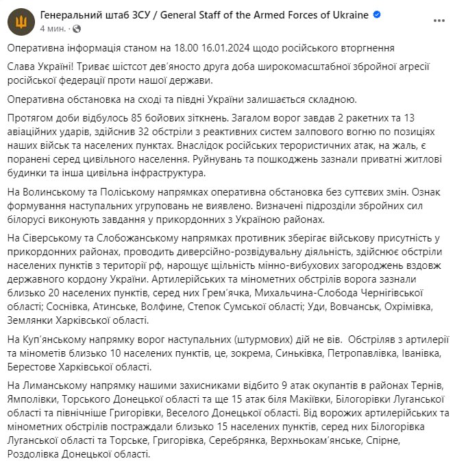 Во вторник, 16 января, в Украине идет 692-й день войны.