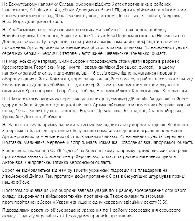 На Авдеевском направлении Силы обороны за прошедшие сутки отбили 18 атак захватчиков в районах Новобахмутовки, Степного, Авдеевки и еще 16 атак - у Северного, Первомайского и Невельского Донецкой области.