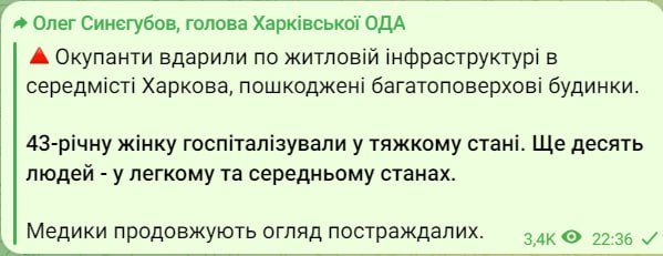 «43-летнюю женщину госпитализировали в тяжелом состоянии. Еще десять человек – в легком и среднем состояниях. Россияне ударили по жилой инфраструктуре в центре Харькова, повреждены многоэтажные дома», – написал Синегубов.