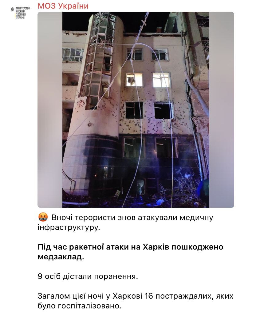 Этой ночью в Харькове ракетным ударом было повреждено медучреждение.