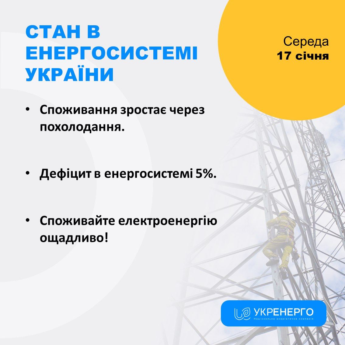 Утром 17 января в энергосистеме Украины присутствует дефицит генерации в 5%.
