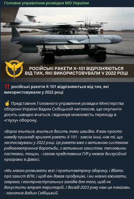 "Враг учится, учится довольно таки быстро. Я вам просто приведу пример: крылатые ракеты Х-101 - совсем другие, чем те, что применяли в 2022 году. Это ракета уже с активной системой радиоэлектронной борьбы, с активной защитой, тепловыми ловушками и т.д.", - рассказал представитель ГУР.