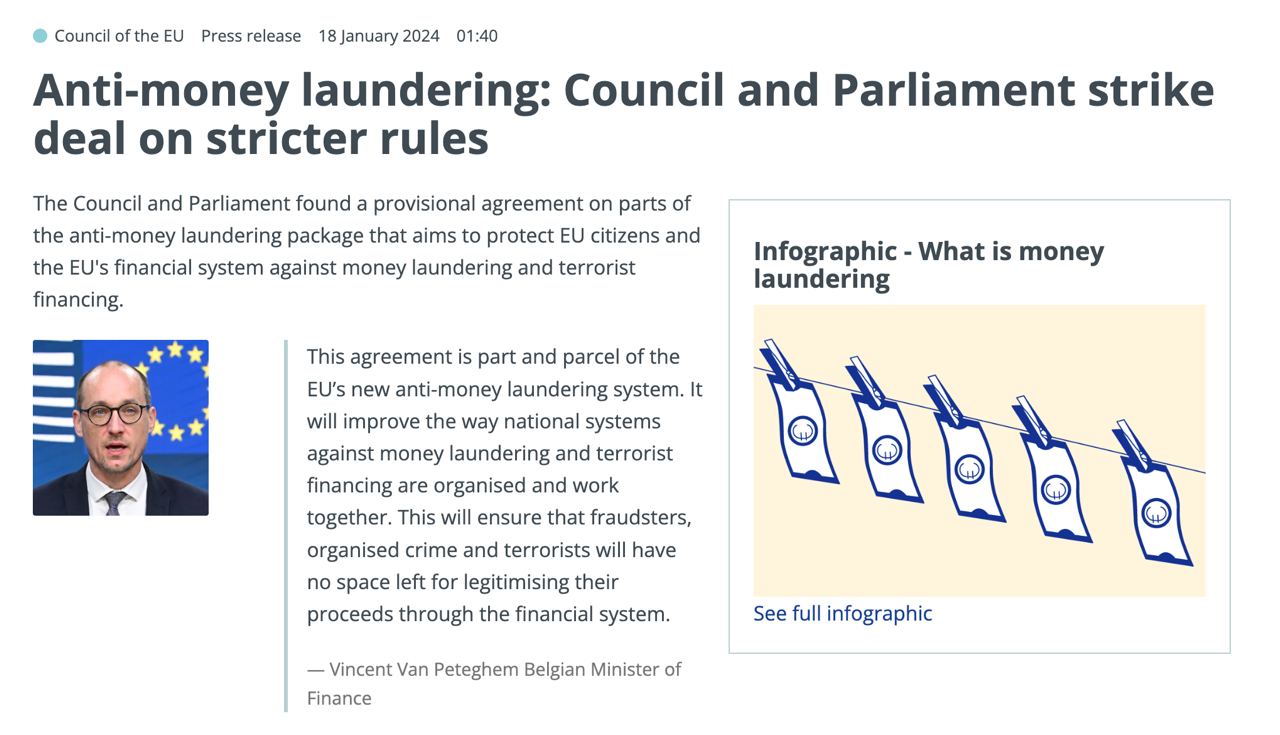 Совет и парламент ЕС 18 января заключили соглашение по борьбе с отмыванием денег и финансированием терроризма.