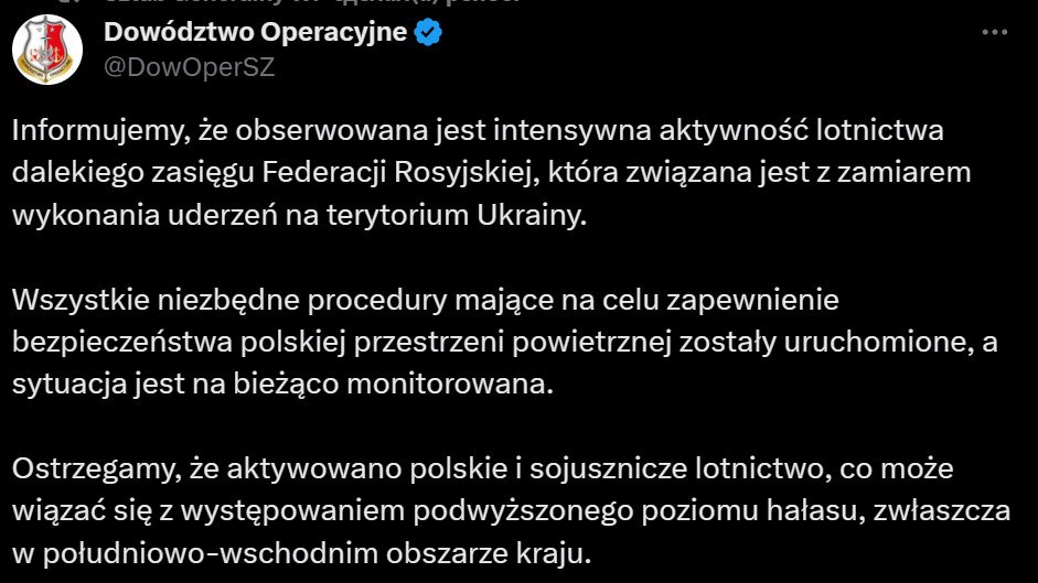 Запущены все необходимые процедуры для обеспечения безопасности воздушного пространства Польши, ситуация постоянно отслеживается.