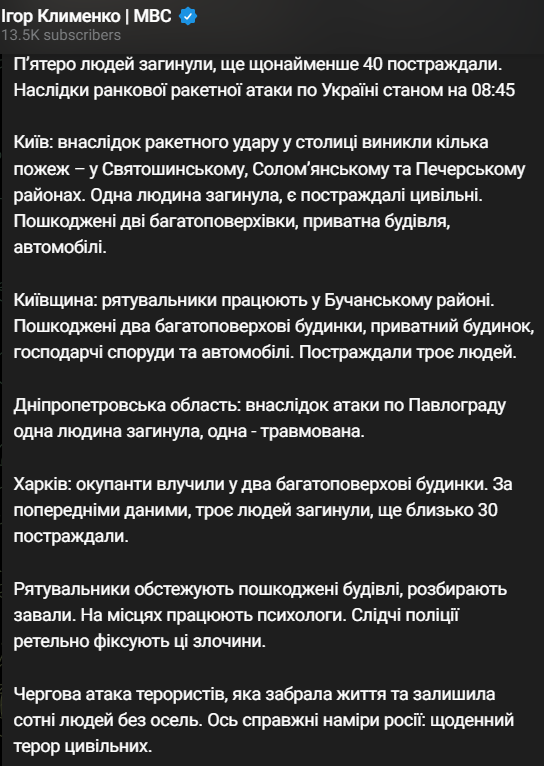В результате утренней ракетной атаки по Украине пять человек погибли, еще по меньшей мере 40 пострадали.