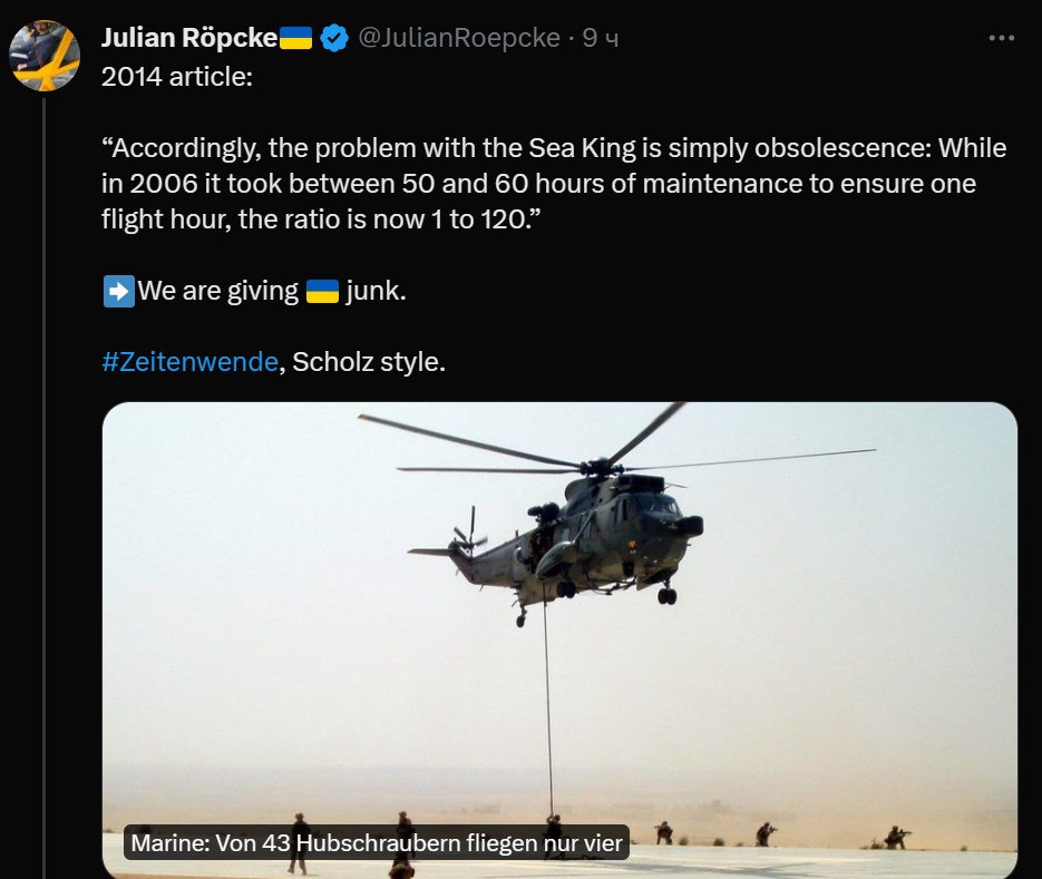 08.48 Военный обозреватель немецкого издания Bild Юлиан Рёпке раскритиковал транспортные вертолеты Sea King, которые Германия вчера согласилась передать Украине.