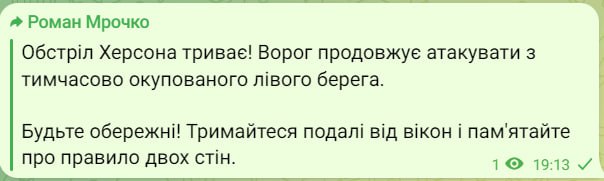 19:16 Херсон под обстрелом, сообщает глава города Роман Мрочко.