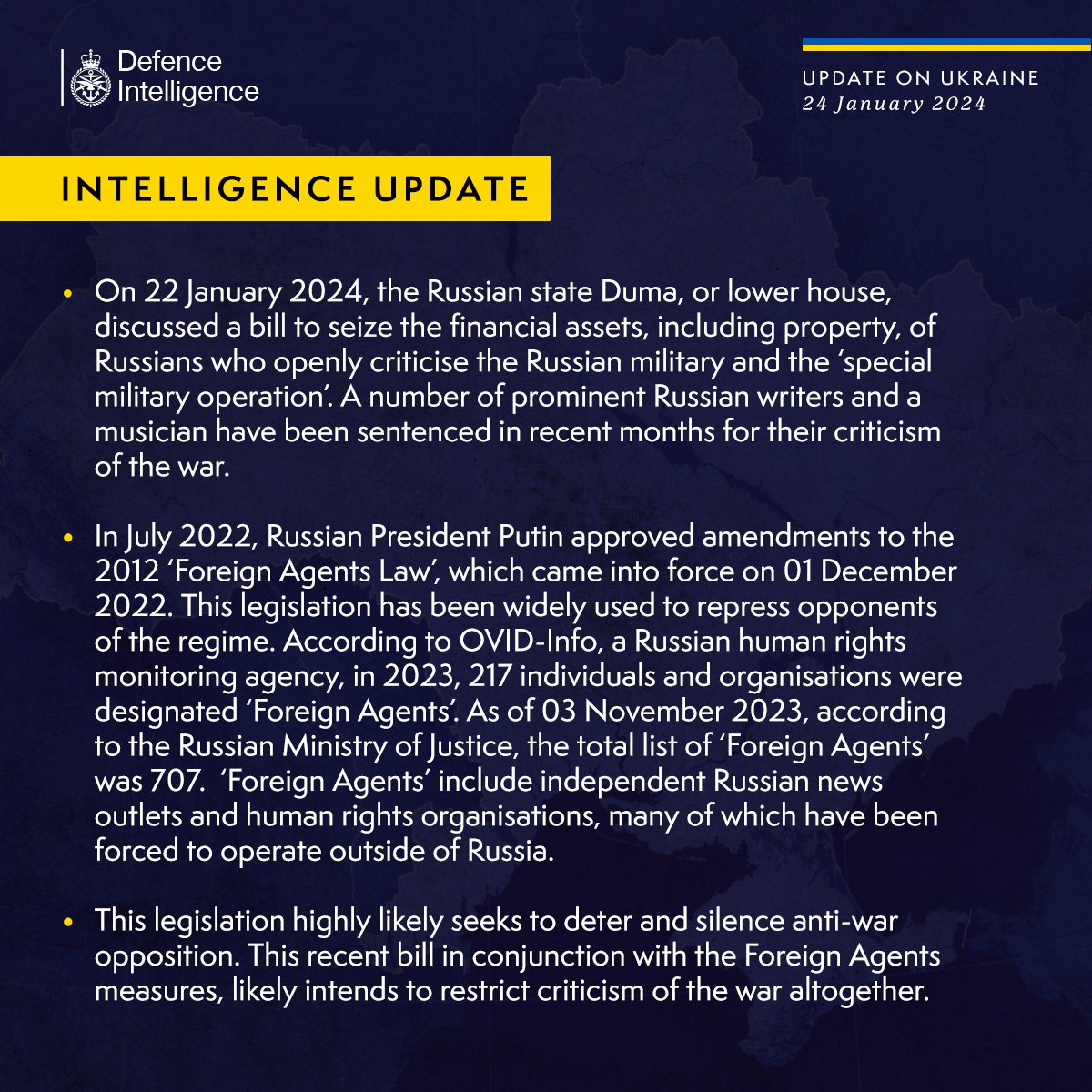 Британская разведка напоминает, что в 2022 году президент Путин подписал поправки к закону о "иностранных агентах" 2012 года, который широко использовался для преследования противников режима. По состоянию на 3 ноября 2023 года общее число лиц, включенных в реестр "иностранных агентов", достигло 707.