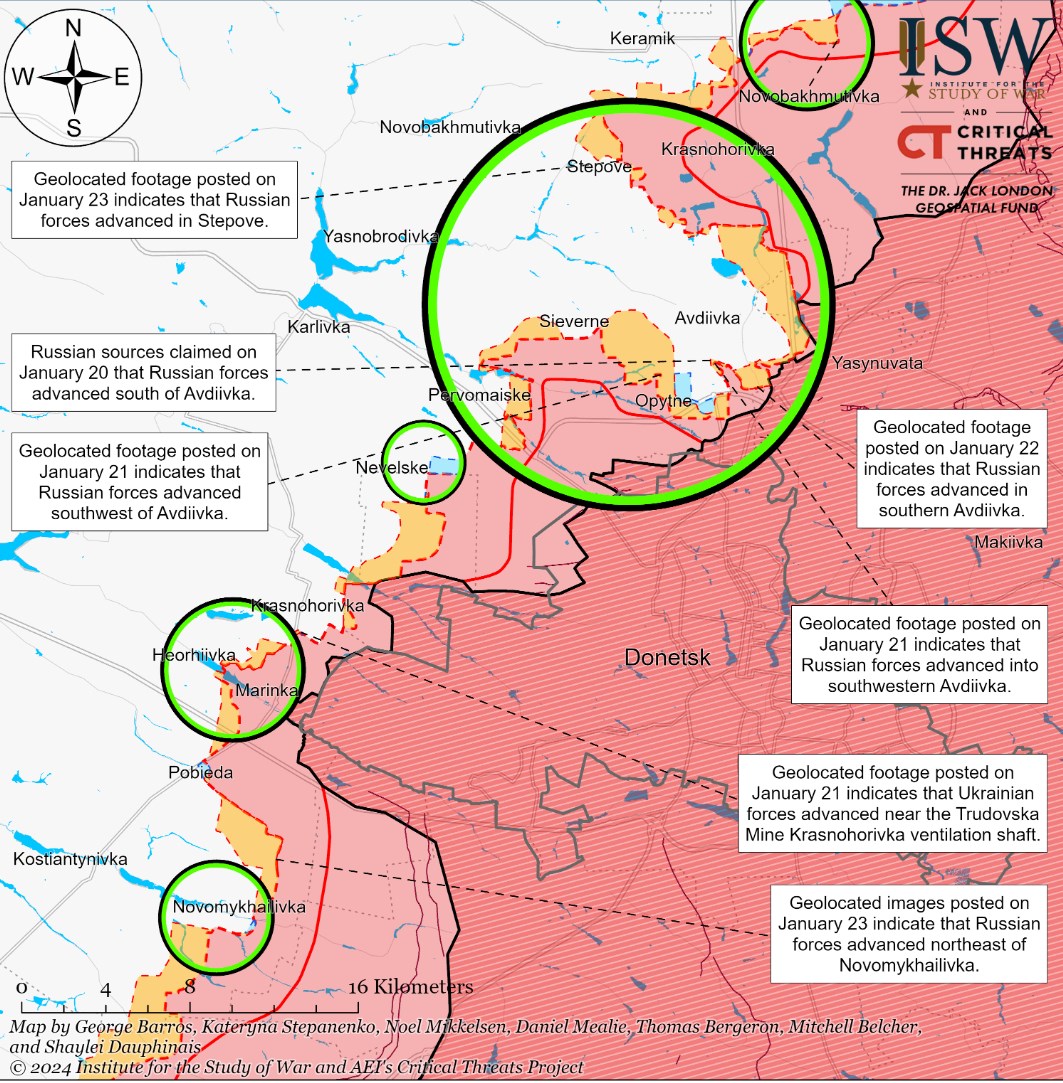 Также, по данным Института, российские войска продвинулись в западной части Степного под Авдеевкой, а также к северо-востоку от Новомихайловки.