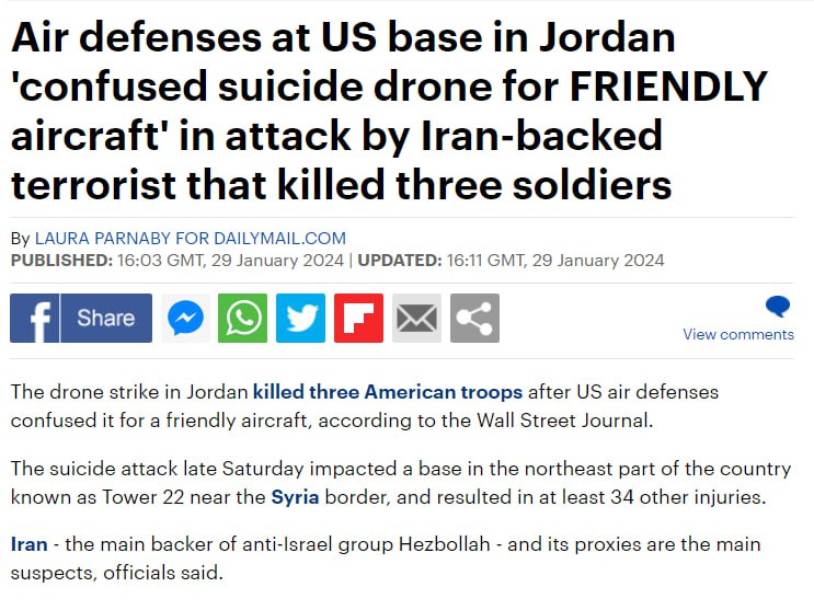Военные США не смогли предотвратить атаку на базу на границе Иордании, поскольку перепутали вражеский дрон со своим.