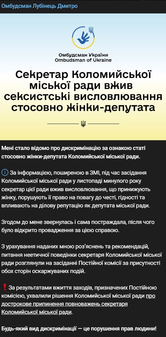 "По информации, распространенной в СМИ, во время заседания Коломыйского городского совета в ноябре прошлого года секретарь этого совета употребил унижающие женщину высказывания, нарушающие ее право на уважение к чести, достоинству и влияющие на деловую репутацию как депутата городского совета", - прокомментировал инцидент Лубинец.