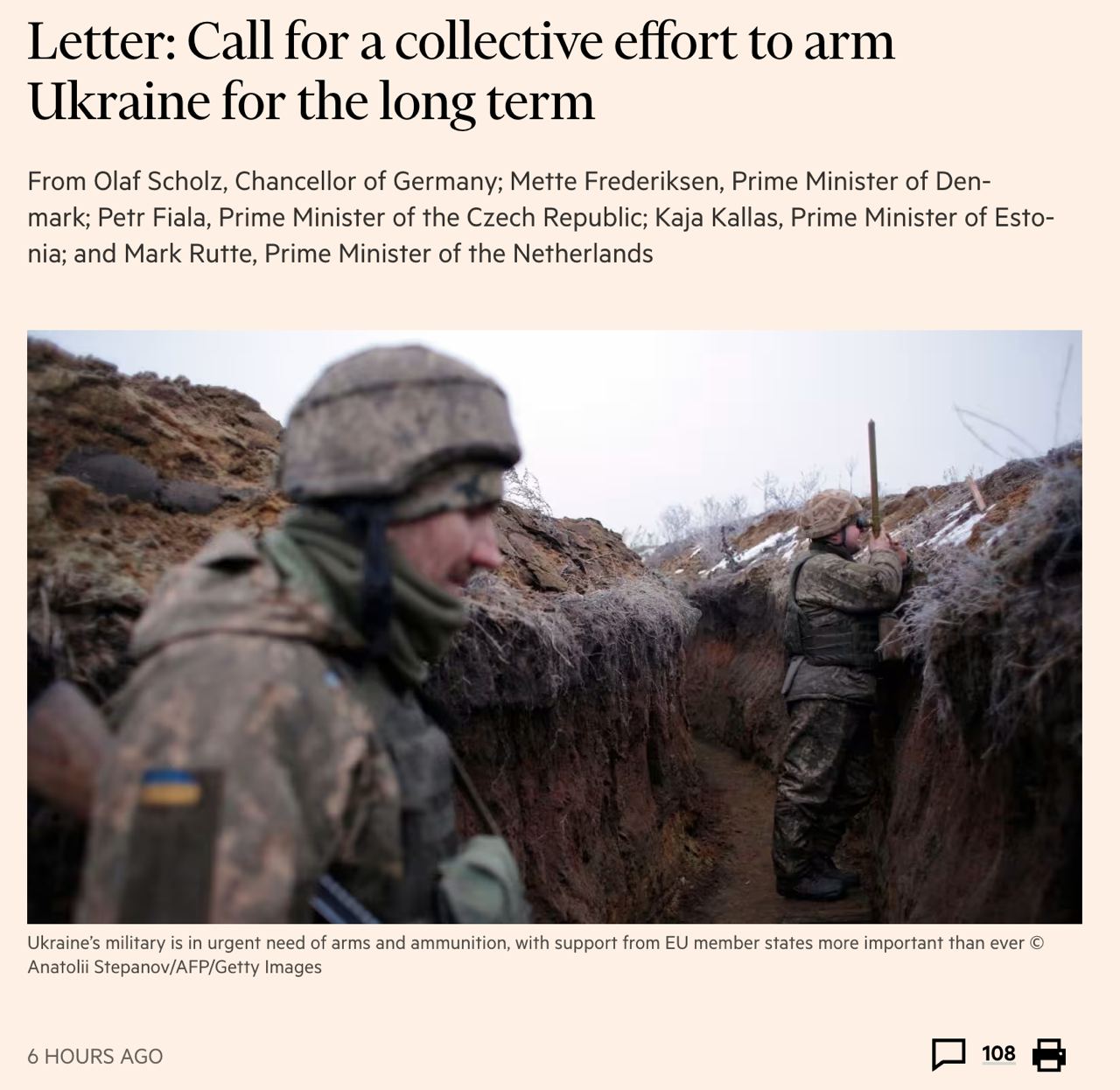 13.20 Financial Times публикует письмо лидеров Германии, Дании, Чехии, Эстонии и Нидерландов с призывом усилить военные поставки Украине.