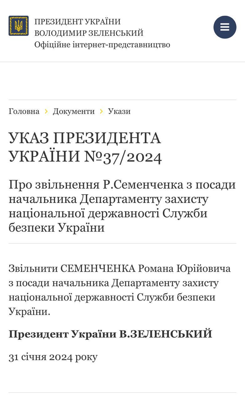 Президент Владимир Зеленский уволил руководителя Департамента защиты национальной государственности СБУ Романа Семенченко.