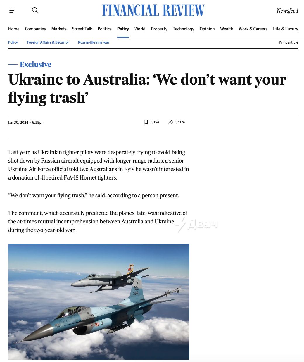 Военно-Воздушные силы (ВВС) Украины отказались от австралийских истребителей F-18 Hornet, назвав их "летающим мусором".