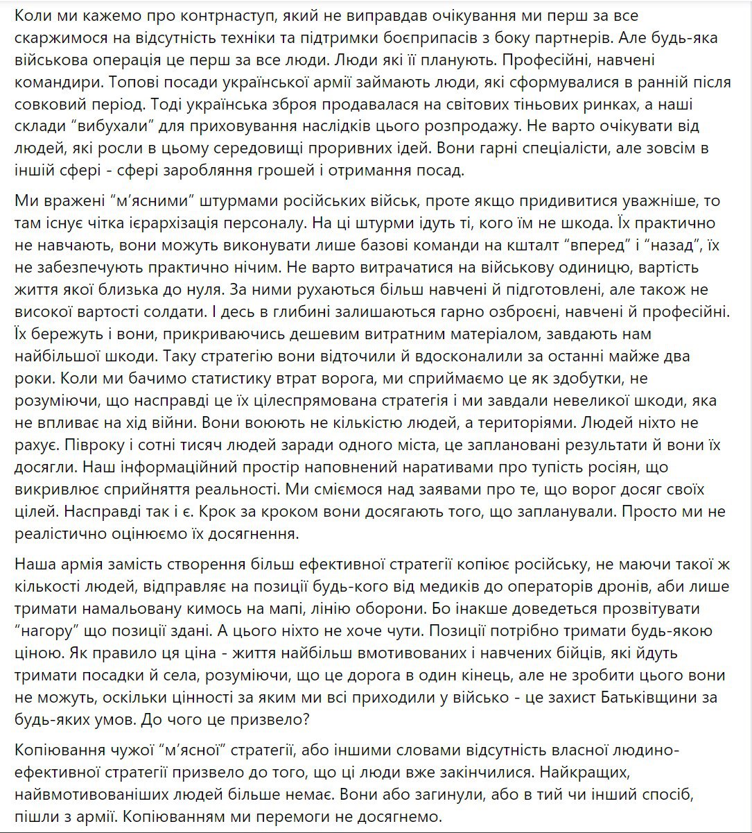 "Наша армия вместо создания более эффективной стратегии копирует российскую, не имея такого же количества людей, отправляет на позиции кого угодно - от медиков до операторов дронов, лишь бы удержать нарисованную кем-то на карте линию обороны. Иначе придется отчитаться "наверх" что позиции сданы. А этого никто не желает слышать", - пишет военный.