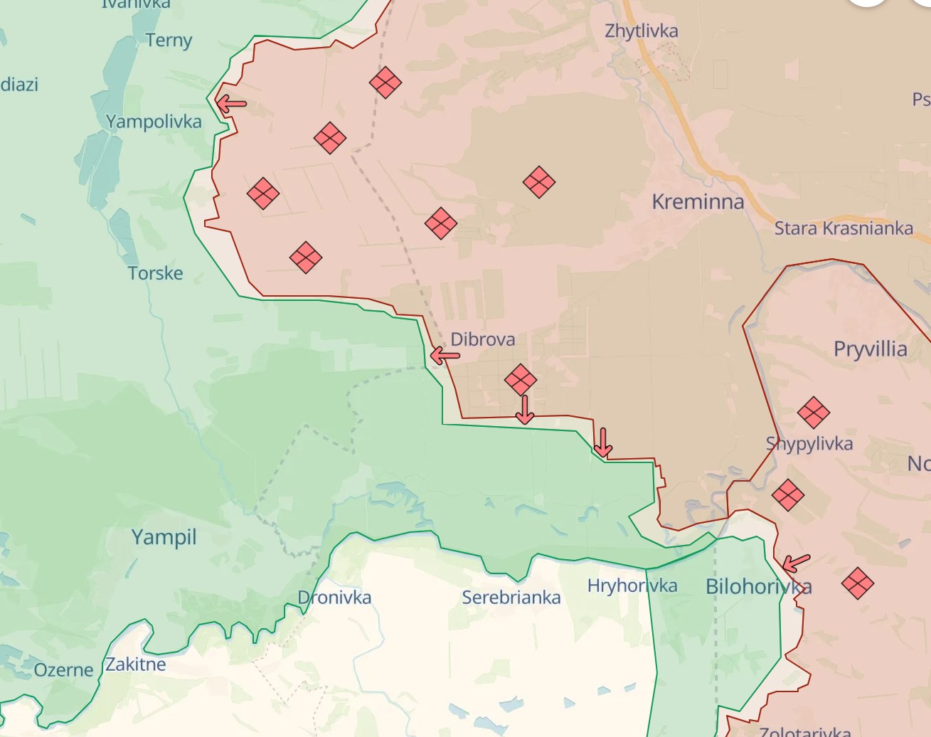 Сложная ситуация на участке Северска - Кременной. Deep State сообщает, что россияне продвинулись с востока к Тернам - Ямполовке, а также пошли в крупную атаку в Белогоровке Луганской области.