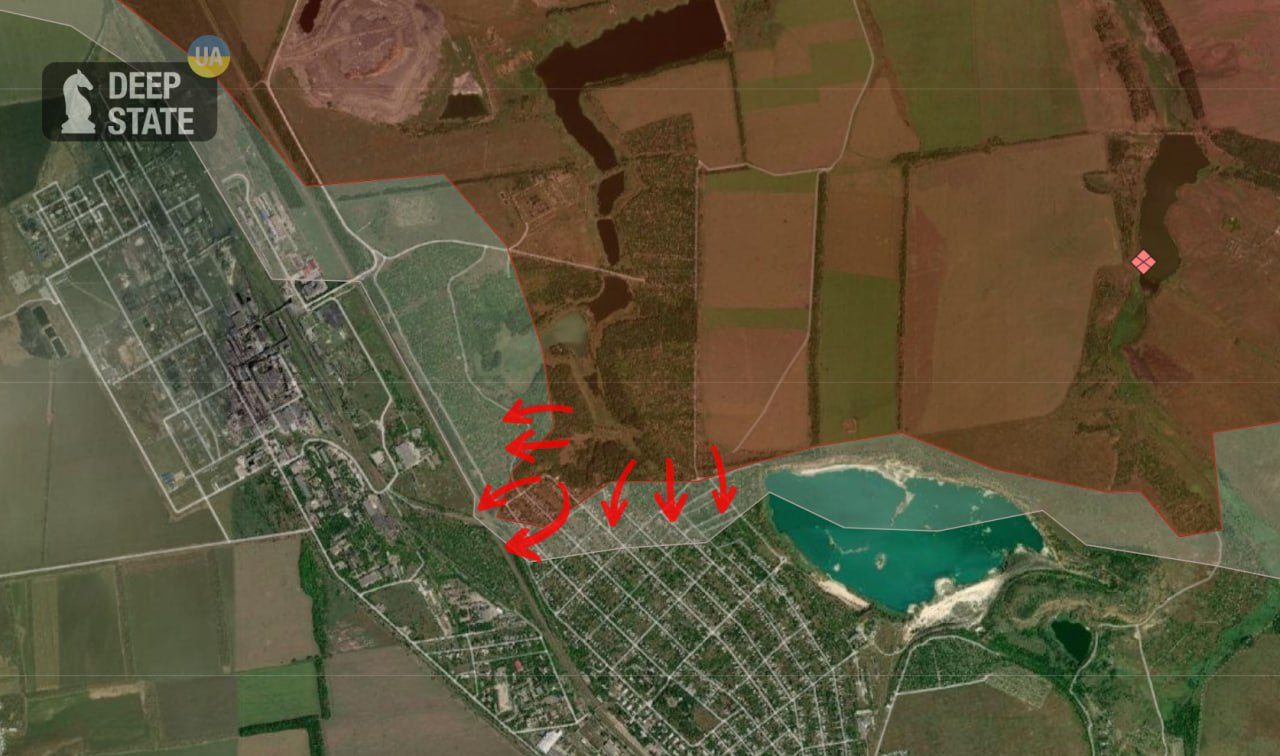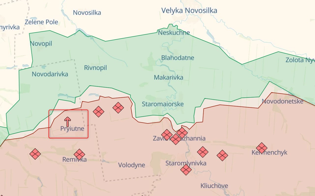 В "ДНР" сегодня заявили, что захватили ряд позиций ВСУ к северу от Приютного на Времьевском выступе. Заявляется, что россияне продвинулись в районе прудов. Украина этого также не подтверждала. При этом на карте Deep State отображены российские атаки к северу от Приютного.