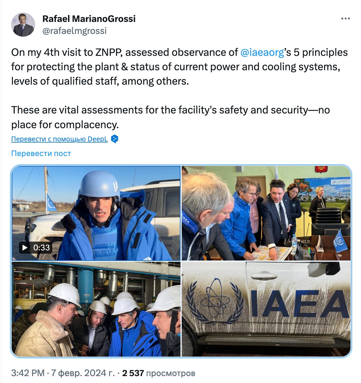 "Я оценил соблюдение 5 принципов МАГАТЭ по защите станции и состояние текущих систем энергоснабжения и охлаждения, уровень квалифицированного персонала и т.д", - пишет он в Х.