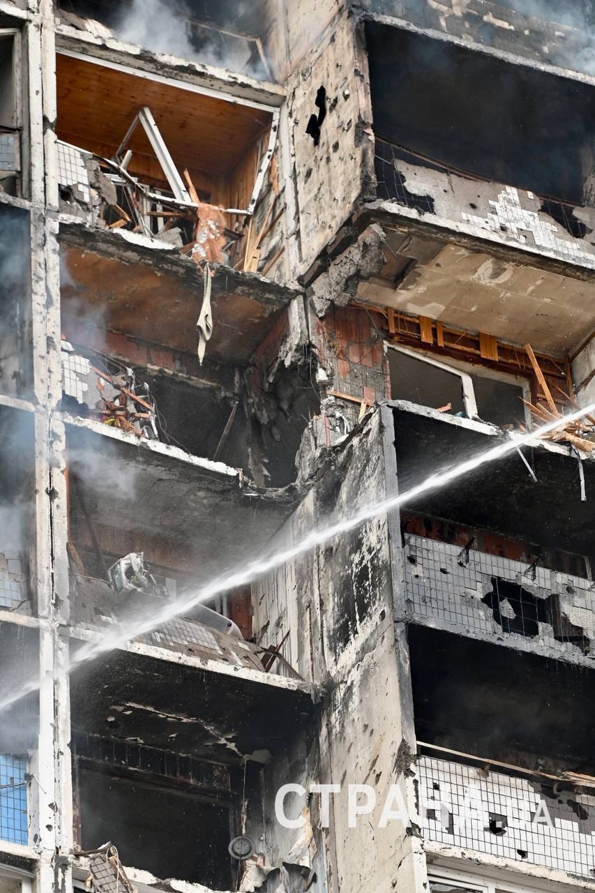 Кадры многоэтажного дома в Голосеевском районе Киева со стороны прилета. Было разрушено несколько балконных перекрытий. Повреждено минимум семь этажей.