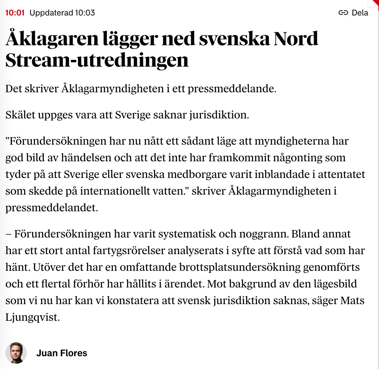 "Предварительное расследование достигло такой стадии, что власти имеют четкое представление об инциденте и не выявлено ничего, что указывало бы на то, что Швеция или шведские граждане были причастны к нападению, произошедшему в международных водах". - сообщает прокуратура в пресс-релизе.