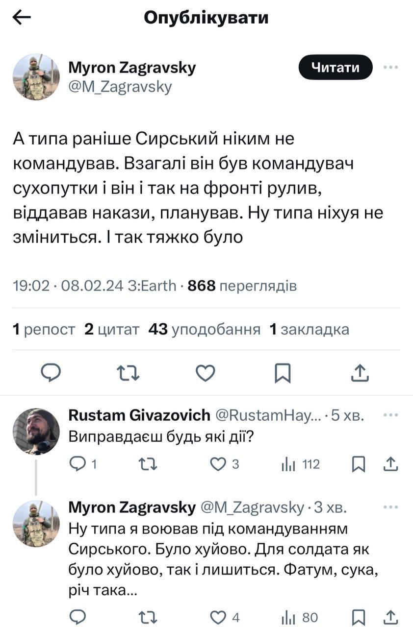После отставки Валерия Залужного среди украинских военных в соцсетях бытует, в основном, два мнения по поводу назначения Александра Сырского главкомом ВСУ — либо на поле боя ничего глобально не изменится, либо станет хуже, так как в военных кругах у Сырского имидж жесткого генерала, который не жалеет солдат ради выполнения задач.