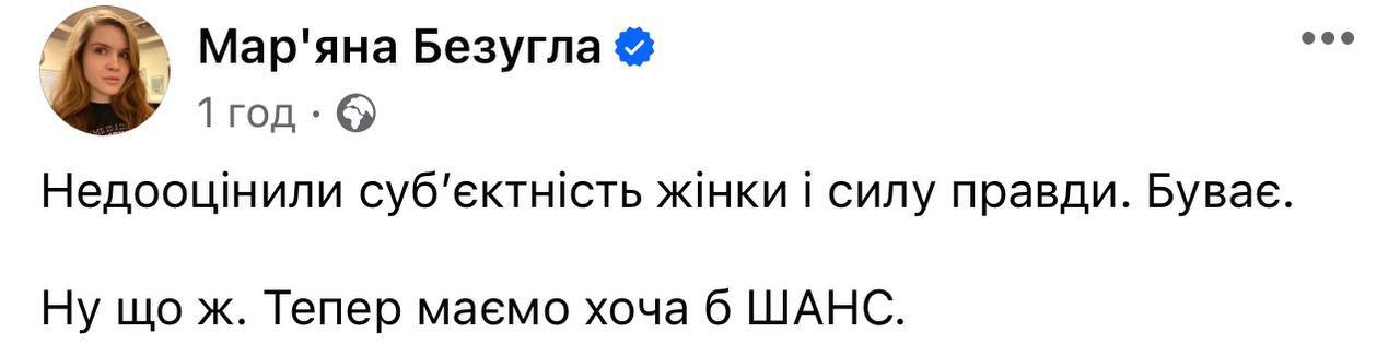 "Недооценили субъектность женщины и силу правды. Бывает. Ну что ж. Теперь имеем хотя бы шанс", — пишет Безуглая.