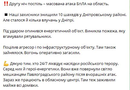 В Днепре помимо электростанции "Шахеды" попали по объекту инфраструктуры, сообщили власти региона.