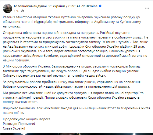 Главнокомандующий ВСУ отметил, что только за последние сутки на направлении Авдеевка украинские защитники отразили 29 атак со стороны российских оккупантов.