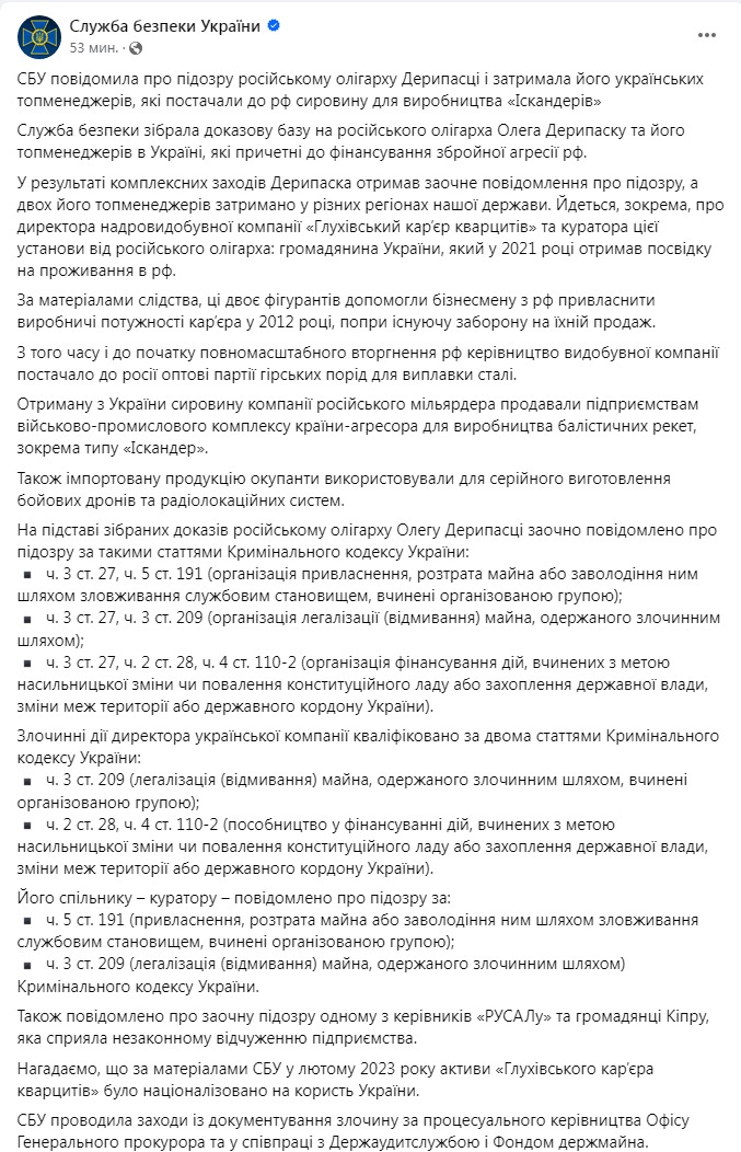 Служба безопасности собрала доказательную базу на Дерипаску и его топ-менеджеров в Украине, причастных к финансированию вооруженной агрессии России. В результате олигарх получил заочное сообщение о подозрении, а два его топ-менеджера задержаны в разных регионах Украины: директор "Глуховского карьера кварцитов" и куратор этого производства, гражданин Украины, который в 2021 году получил вид на жительство в России.
