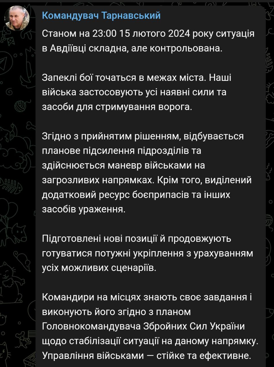 Тарнавский пишет, что в городе идет "плановое усиление подразделений", "логистика работает", проводятся рейдово-ударные действия с целью расширить логистические коридоры. А боеприпасы и оружие поставляются "в увеличенных объемах" по поручению главкома.