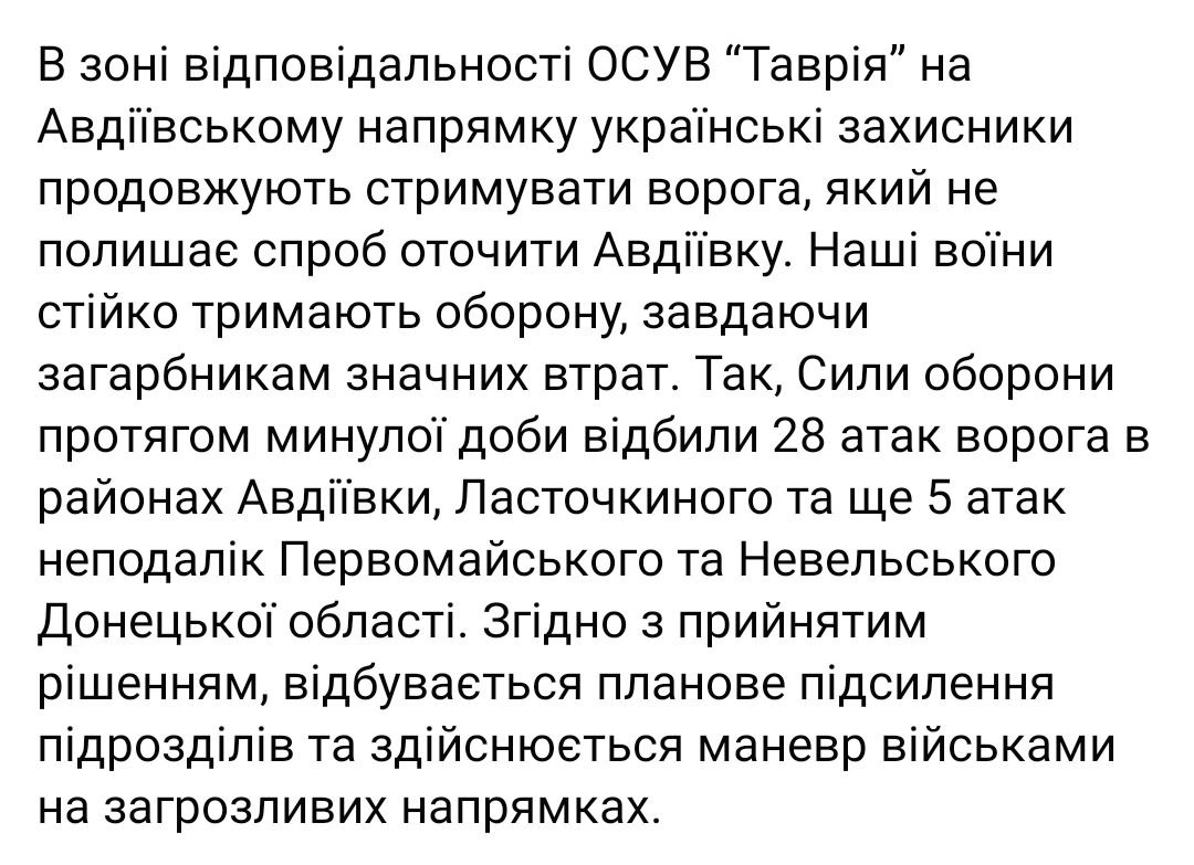 06.50 Командующий группировкой "Таврия" Тарнавский назвал ситуацию в Авдеевке "сложной, но контролируемой".