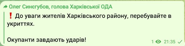 21.38 Глава Харьковской ОВА Олег Синегубов сообщил об обстреле Харьковского района.