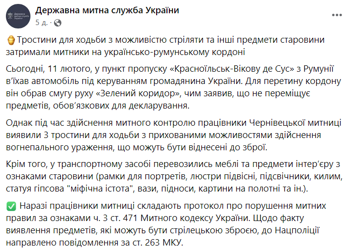 "Сегодня, 11 февраля, в пункт пропуска "Красноильск-Викова де Сус" из Румынии въехал автомобиль под управлением гражданина Украины. Для пересечения границы он выбрал полосу движения "Зеленый коридор", чем заявил, что не перемещает предметы, обязательные для декларитриования. Однако во время осуществления таможенного контроля работники Черновицкой таможни обнаружили 3 трости для ходьбы со скрытыми возможностями осуществления огнестрельного поражения, которые могут быть отнесены к оружию.
