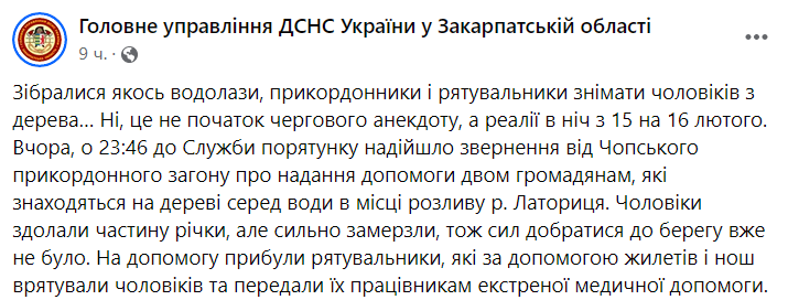 Инцидент произошел ночью 15 февраля вблизи государственной границы Украины между селами Соломоново и Тийглаш Ужгородского района. В ГСЧС рассказали, что сообщение поступило от пограничников Чопского отряда.