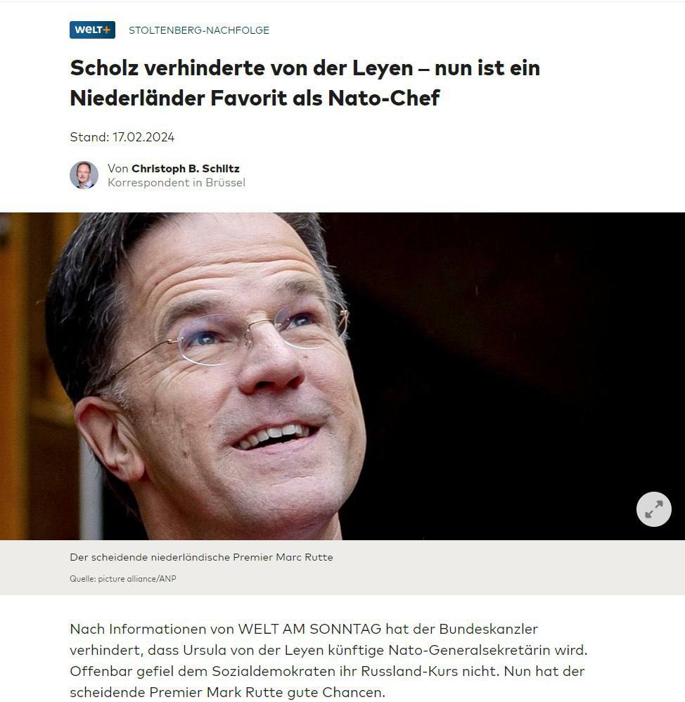 Канцлер Германии Олаф Шольц заблокировал назначение действующего председателя Еврокомиссии Урсулы фон дер Ляйен на должность генерального секретаря НАТО.