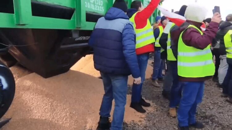 Польские фермеры высыпали украинское зерно из грузовых вагонов. Скриншот из видео