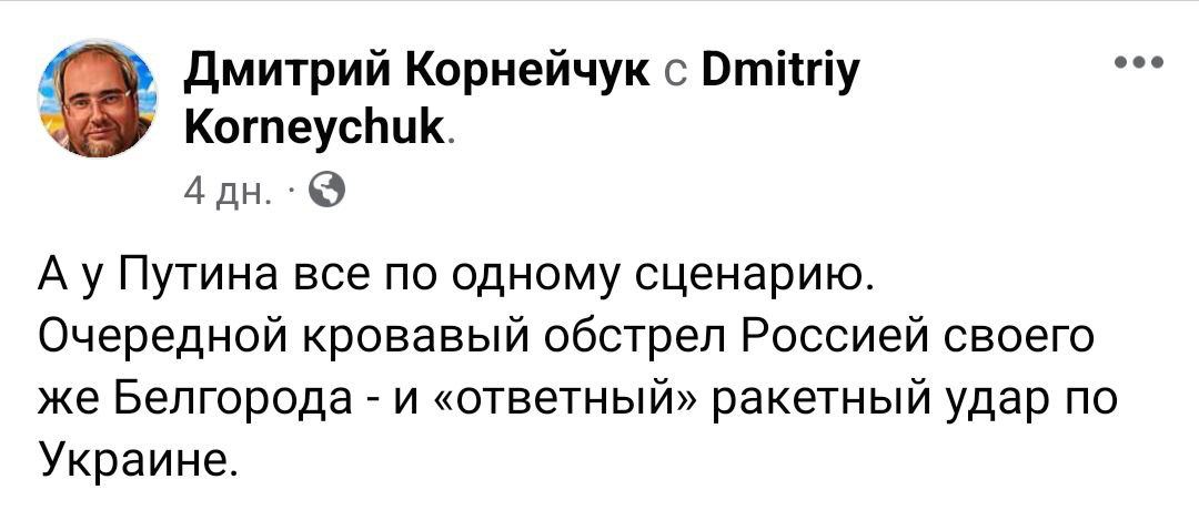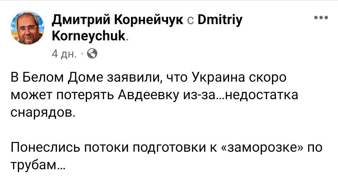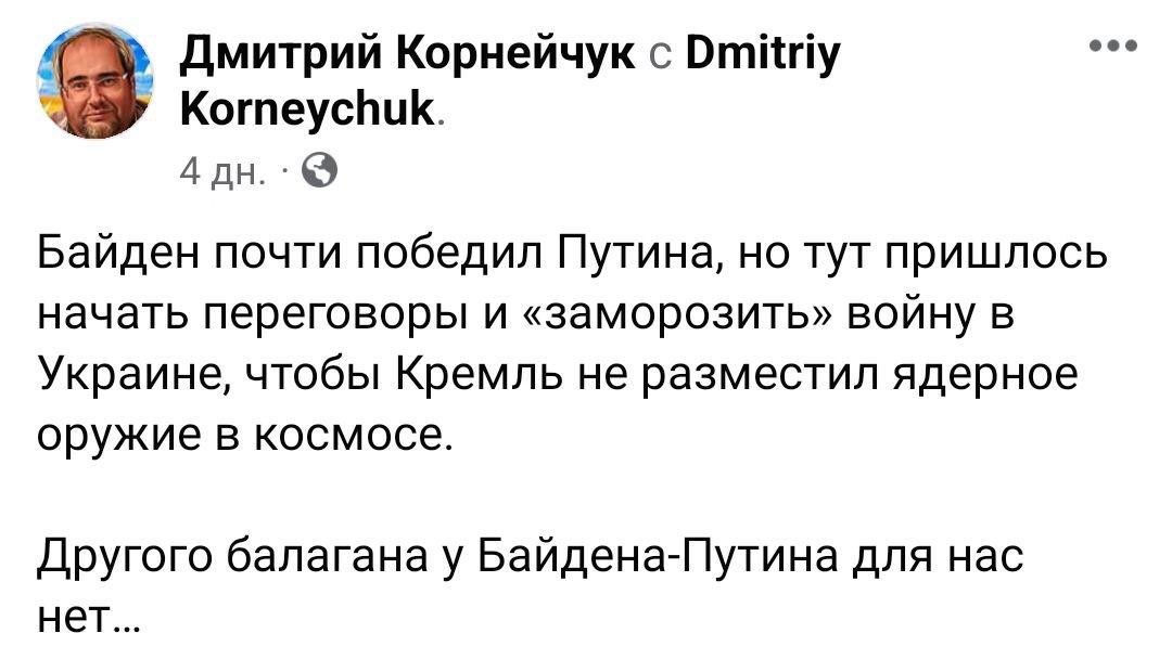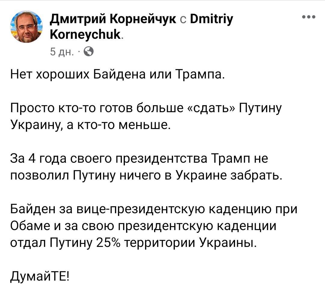 В Фейсбуке Корнейчука превалируют посты с критикой Байдена и тезисами, что он планирует заморозку войны и "договорняк" с Путиным.