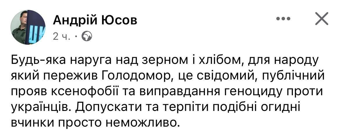 "Любое надругательство над зерном и хлебом для народа, пережившего Голодомор, - это сознательное, публичное проявление ксенофобии и оправдание геноцида против украинцев. Допускать и терпеть подобные отвратительные поступки просто невозможно", - написал Юсов В Фейсбуке.