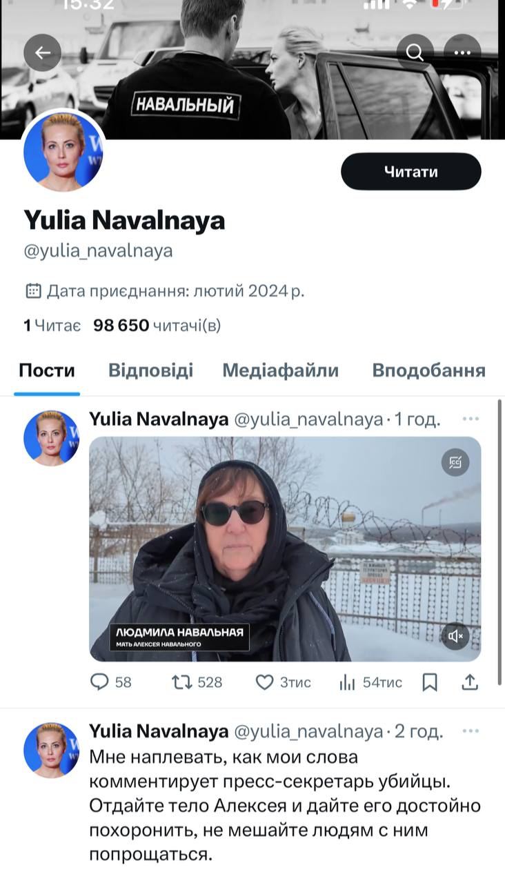 Навальная создала аккаунт в Х в понедельник и опубликовала в нем свое видеообращение, в котором пообещала продолжить дело мужа. А уже во вторник днем многие мировые СМИ обратили внимание, что страница стала недоступной.